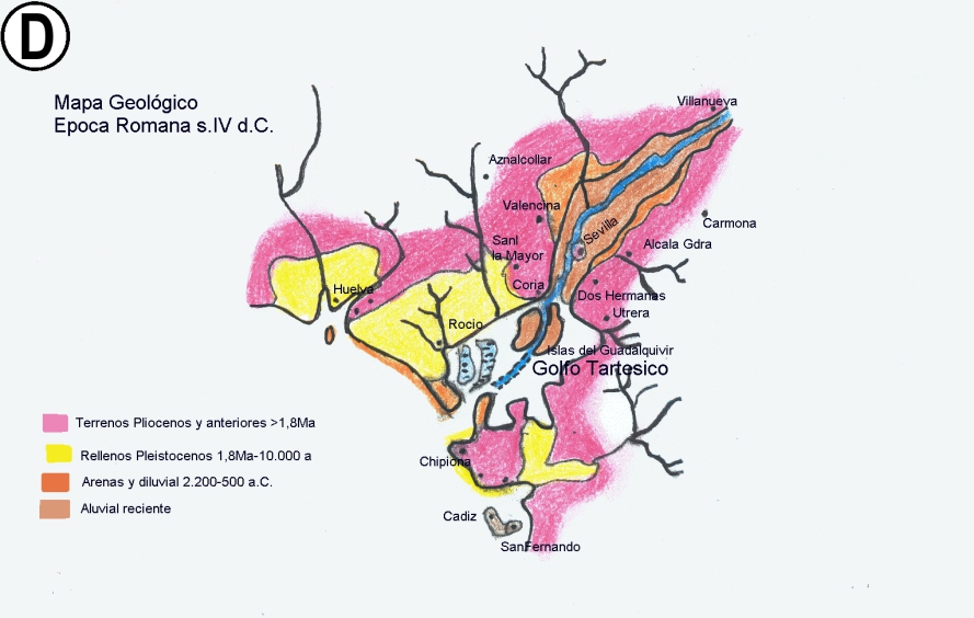 E11-D. Mapas geológicos de la evolución del estuario del Guadalquivir, época romana. Profesor Francisco José Barragán de la Rosa. Enlace http:///fcojose/entornodetartessos