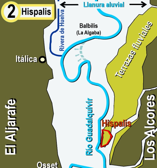 Hispalis en cambio, en la orilla izquierda de la desembocadura del Bætis, era una ciudad comercial, puerto intermedio entre Gades y Corduba. A diferencia de Itálica, abandonada en tiempo de la invasión árabe, apenas nos han llegado restos visibles de Hispalis, sepultada por los sucesivos asentamientos de la ciudad. Hispalis y su puerto fueron cobrando importancia con el comercio de la minería y los productos de la vega del Bætis, como el trigo, el vino, y especialmente el aceite*.