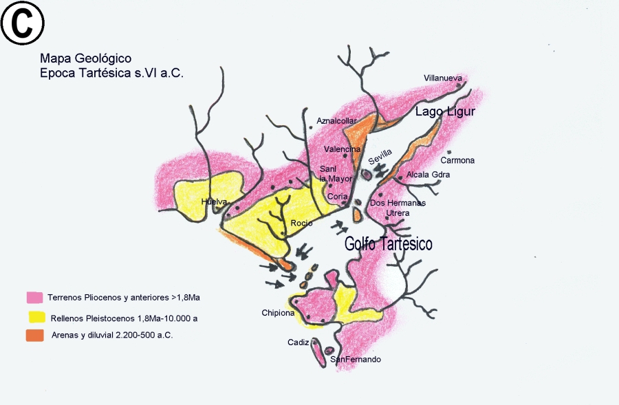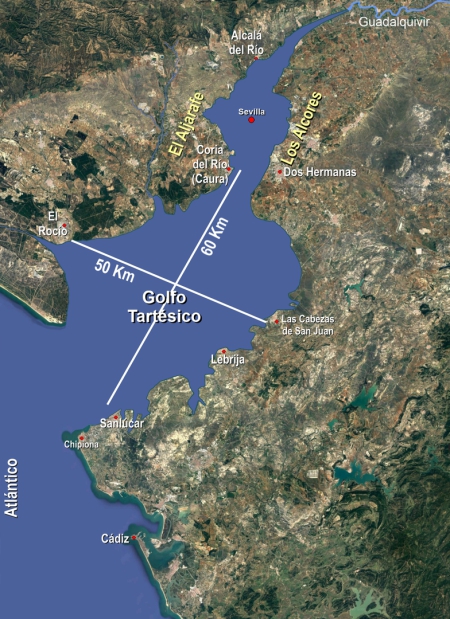 El Golfo Tartésico (siglos XL a X a.C.), con una amplitud de unos 50km, se extendía hacia el interior más de 110Km considerando la línea actual de costa. A unos 60km de esa distancia, el golfo reducía su holgura en el Estrecho de Caura, entre Caura y Orippo (Coria del Río y Dos Hermanas), se prolongaba entre los terrenos más elevados del Aljarafe y los Alcores*, y se extendía después por los pies de Sierra Morena hacia el nordeste (E4-1).