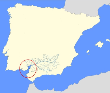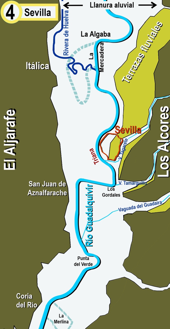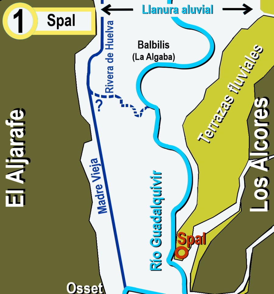 En la época de Spal (imagen superior E8-1), con el avance de la colmatación del Lago Ligustino, aunque se barajan otras posibilidades, una hipótesis es que dos ríos recorrían el valle del entorno de la ciudad. Por el oeste, el río Rivera de Huelva se prolongaba hacia el sur paralelo al Aljarafe por lo que siempre se ha llamado la "madre vieja", desembocando en el Guadalquivir a la altura del asentamiento turdetano de Osset (San Juan de Aznalfarache). Algunos autores consideran que nunca fue un cauce estructural y siempre actuó como tributario en las crecidas.