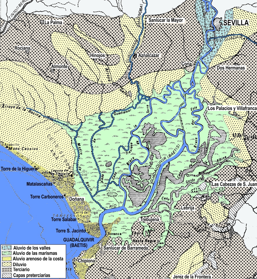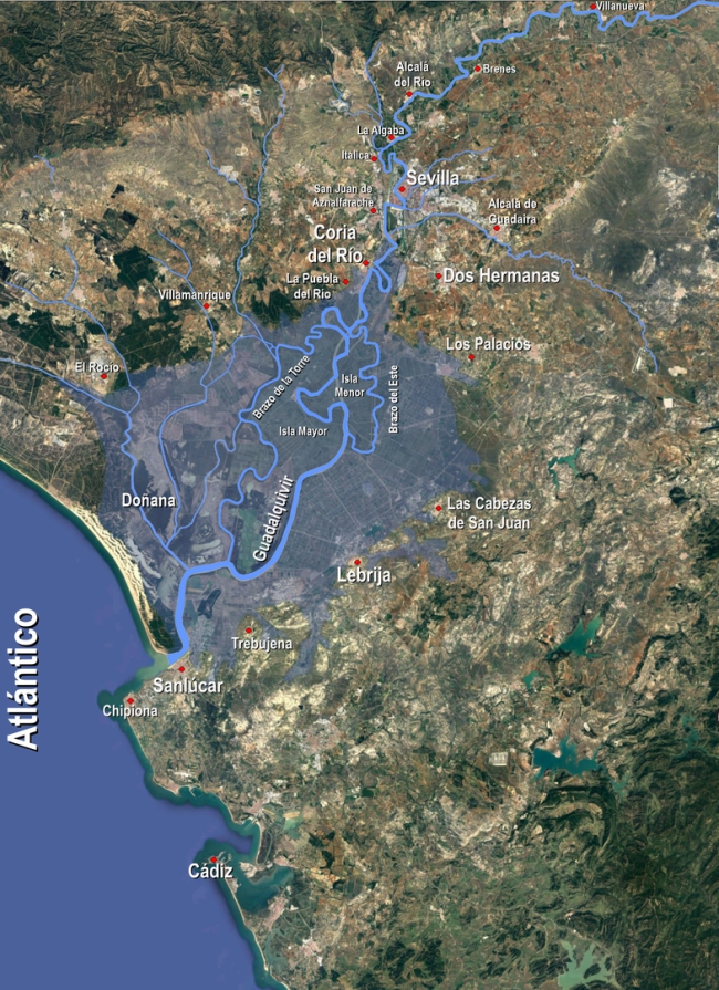 La colmatación iría avanzando de norte a sur, y de los laterales hacia el interior, emergiendo islas entre los brazos de río y zonas de marismas a cada lado, las de Lebrija al este y las de Doñana al oeste. Como resultado, se formó una extensa llanura de 2.000km2, por la que discurre el río en tortuosos brazos con numerosos meandros por la nula inclinación del terreno, entre arroyos, lagunas y zonas inundables, condicionado todo por el entrante de las mareas. La navegación se iría limitando progresivamente al cauce del río y la ciudad se distanció del mar con su desembocadura en Sanlúcar de Barrameda, a 124km de navegación del puerto de Sevilla por los numerosos meandros* (E5, E7).