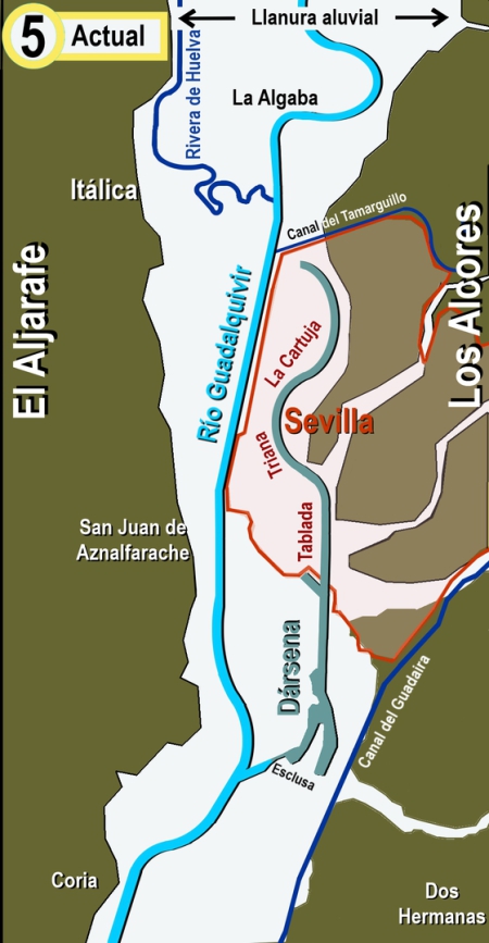 Por último, en cuanto a la evolución paleohidrográfica del Guadalquivir, el cauce ha sufrido continuos cambios de posición o desvíos en todo su trayecto, y en el entorno de Sevilla no sería diferente con su escasa pendiente. Considerando el recorrido del Guadalquivir entre La Algaba y Coria del Río, existen dos períodos con cambios de mención en el cauce. Uno es anterior a los romanos, en la época turdetana, y el otro en la árabe califal o almorávide del siglo X-XI, coincidiendo con grandes avenidas.