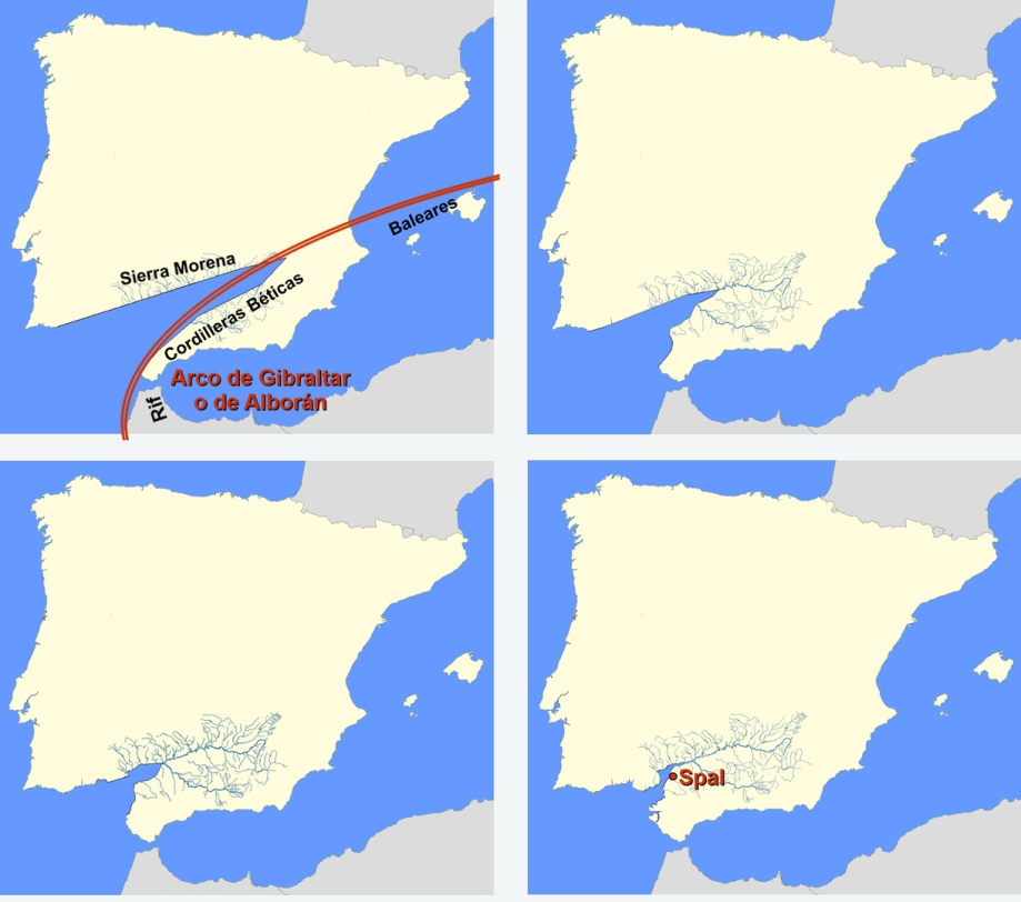 E3-2. Esquema de la evolución de la Depresión Bética con el avance de la sedimentación, representado en un mapa actual. Evidentemente, tanto el litoral de la Península como el propio río Guadalquivir, eran diferentes en esas épocas.