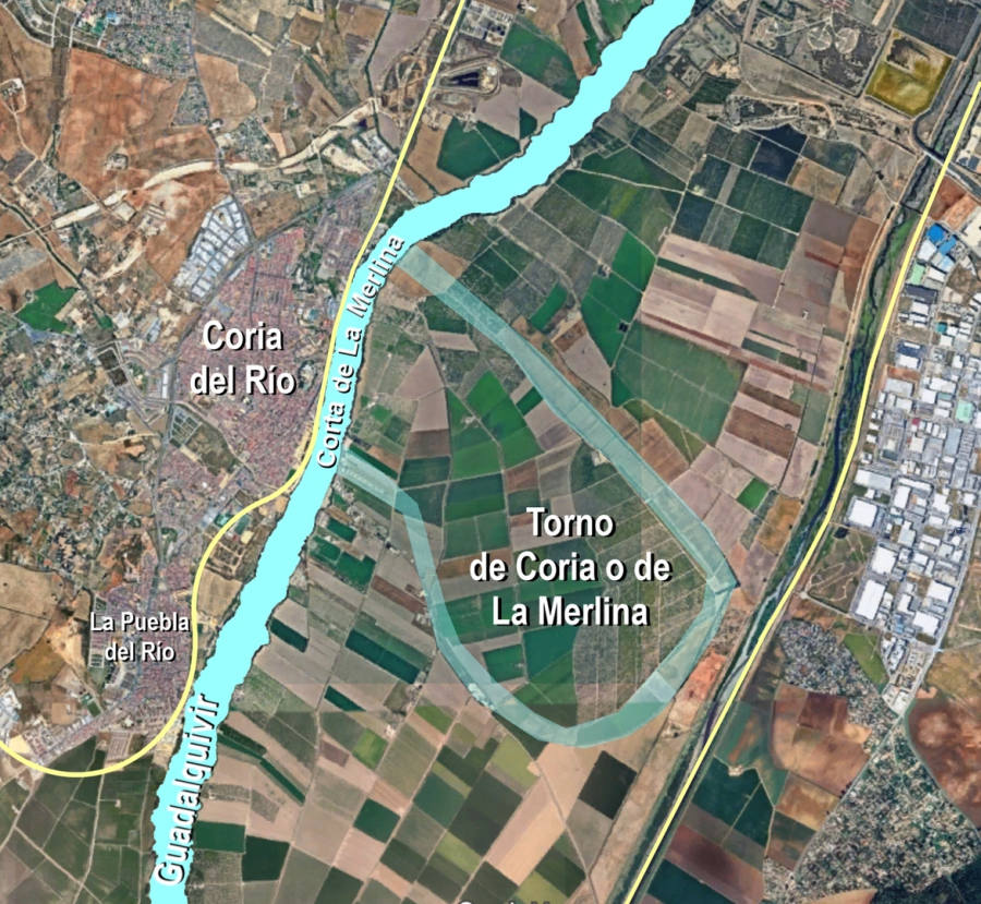 Otro gran meandro a la altura de Coria del Río, el torno de La Merlina, se formó también en esta época árabe. Situado en el estrecho de Caura, la salida del río a las marismas, complicaría mucho la navegación durante la etapa castellana por la pérdida de fondo en las curvas de su largo recorrido de 10km en las proximidades de la ciudad, además de dificultar la evacuación del agua en las avenidas del río (E10).