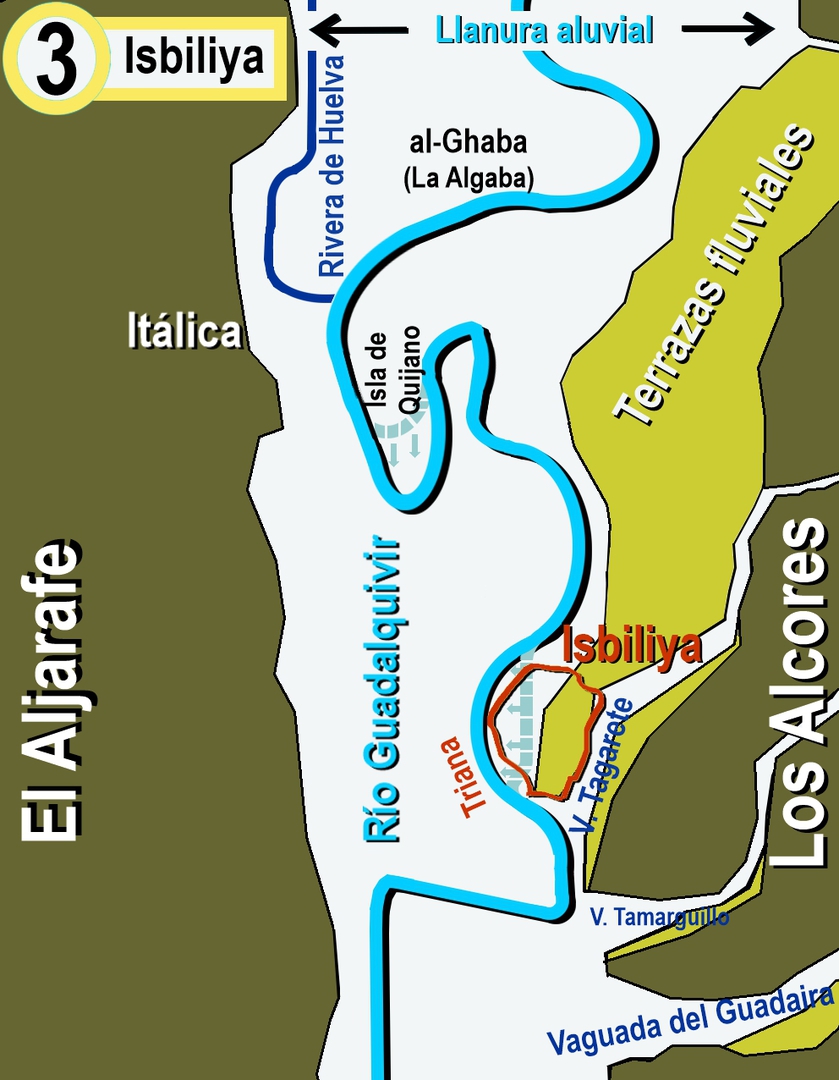 En la época árabe, tuvieron lugar grandes cambios por avenidas extraordinarias del Guadalquivir. El meandro río abajo de La Algaba, que los árabes ya llamaban al-Ghāba, "el bosque", se prolongó todavía más hacia el sur, limitando la Isla de Quijano (E8-3).