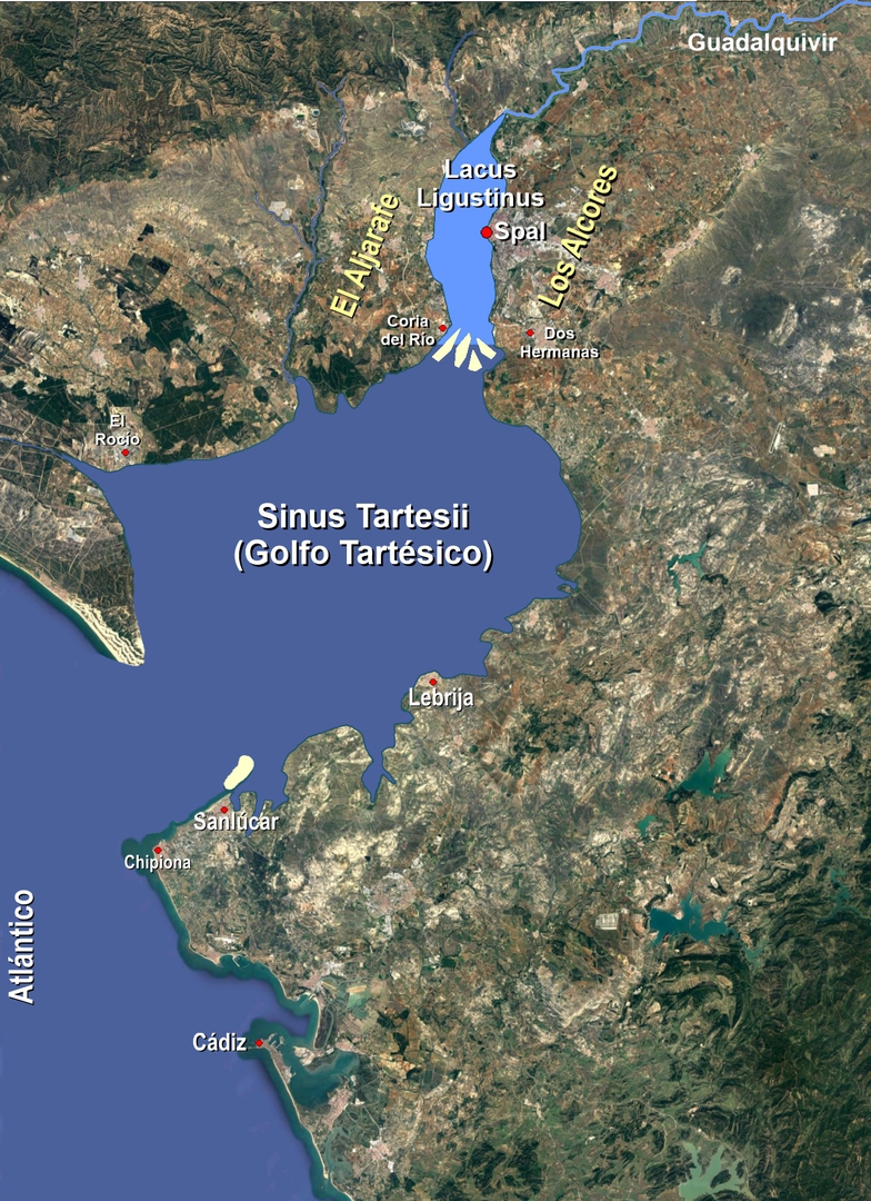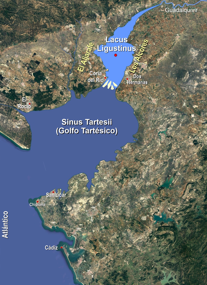 El Lago Ligustinus o Ligur no se corresponde con las marismas del Guadalquivir, como se indica en la mayoría de artículos y gráficos que se publican. Aunque ambos formaron parte y tienen su origen en el antiguo Golfo Tartésico, el Lacus Ligustinus se localizó al norte del Estrecho de Caura, entre el Aljarafe y los Alcores. Esta confusión deriva principalmente de interpretaciones de la Ora Marítima de Avieno. Una obra poética del siglo IV d.C., basada en escritos inéditos y cartas marinas de muchos siglos antes (s.VI a.C.), que fue adoptada por prestigiosos investigadores de Tartessos, como Schulten en el siglo pasado (E7).