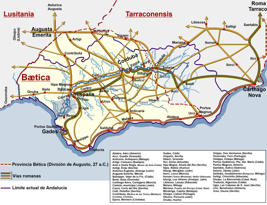Los romanos, con las guerras púnicas iniciaron su expansión exterior, llamaron Bætis al río, Turdetania a la antigua región de los tartesios, e Hispania a sus territorios en la Península. Inicialmente dividieron Hispania en dos provincias, Hispania Citerior y Ulterior, esta última con su capital Corduba (Córdoba). A finales del siglo I a.C., Augusto dividió Hispania Ulterior en dos, la Bética y Lusitania, con Corduba y Augusta Emerita (Mérida) como capitales. Las principales ciudades de la Bética se concentraron en la ribera del Bætis, explotando su navegabilidad.