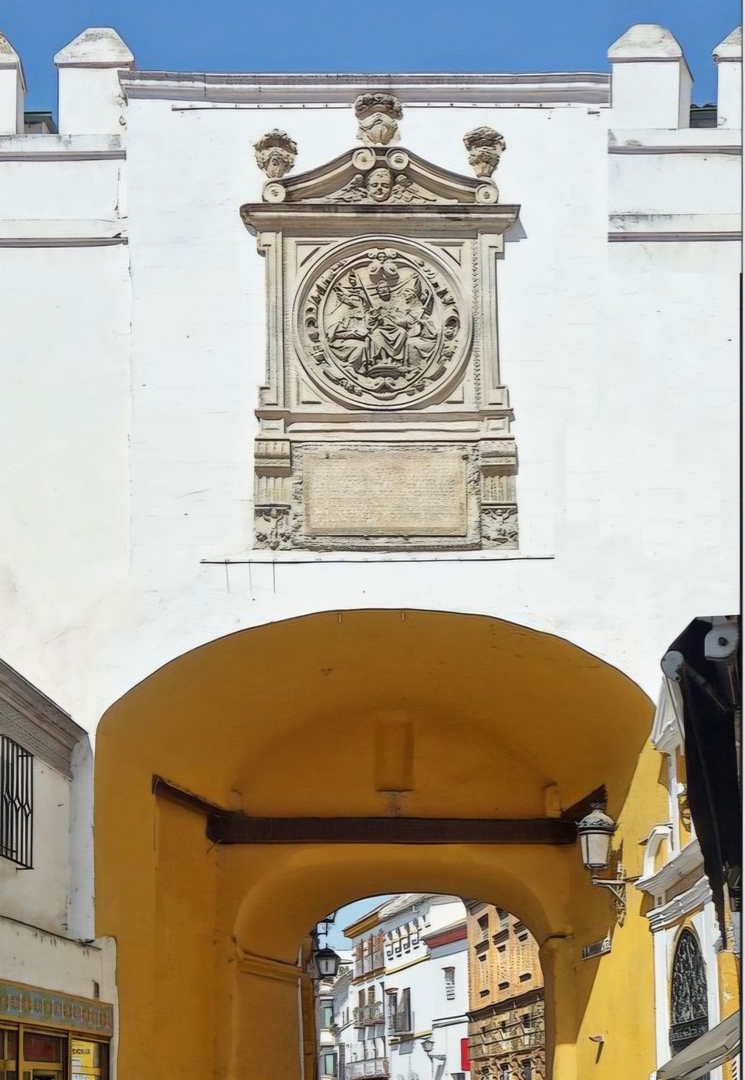 Postigo del Aceite de Sevilla (la Puerta de los Barcos almohade del siglo XII). Detalle del escudo de de la ciudad de J.B. Vázquez el Viejo que adorna la parte superior del arco, incorporado en la reforma del conde de Barajas del siglo XVI.
