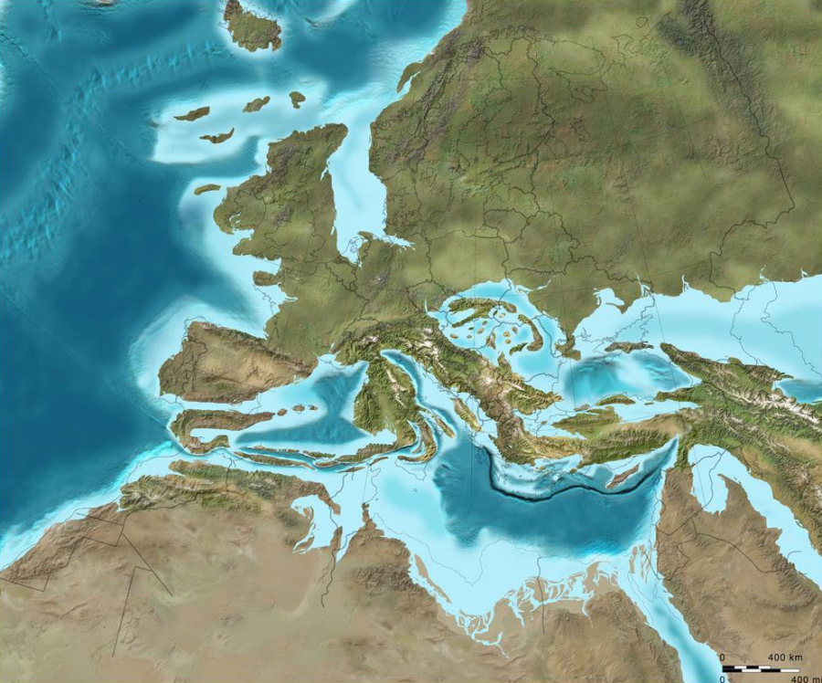 E3-1. Reconstrucción paleogeográfica de Europa y la Península Ibérica en el Mioceno. Arco de Gibraltar o de Alborán, corredores Bético y Rifeño