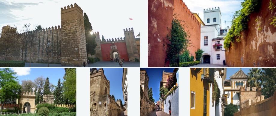 E2. Murallas del Alcazar en la Plaza del Triunfo, Jardines de Murillo y la Judería. Abajo, en el centro y derecha, el callejón del Agua con sus conducciones de agua en la muralla.