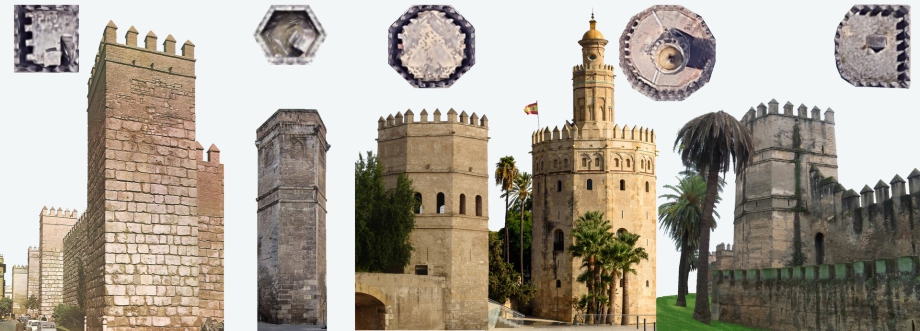 Fotografías de las torres y vista aérea de su planta. De izquierda a derecha, Torres del Alcázar cuadradas, Torre de Abd el-Aziz hexagonal, Torre de la Plata octagonal, y la Torre del Oro dodecagonal. En el extremo de la derecha, la Torre Blanca de la Macarena.