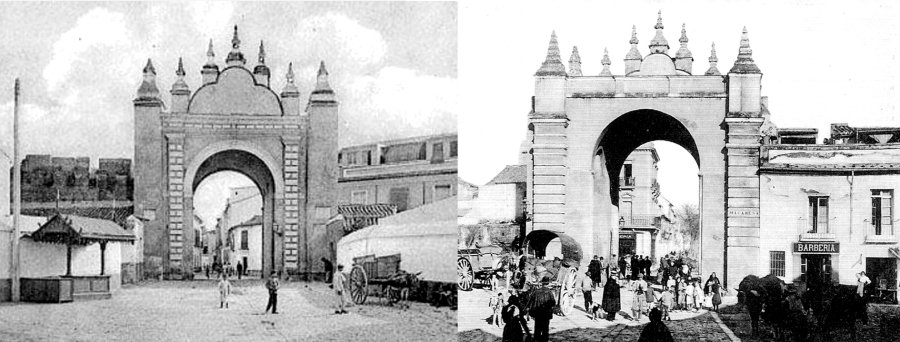 La imagen superior de la Puerta de Carmona y el Acueducto, es una litografía coloreada de 1844 de Jenaro Pérez Villaamil, del tomo II de España artística y monumental. La inferior, es una fotografía que debe ser de mediados del siglo XIX.